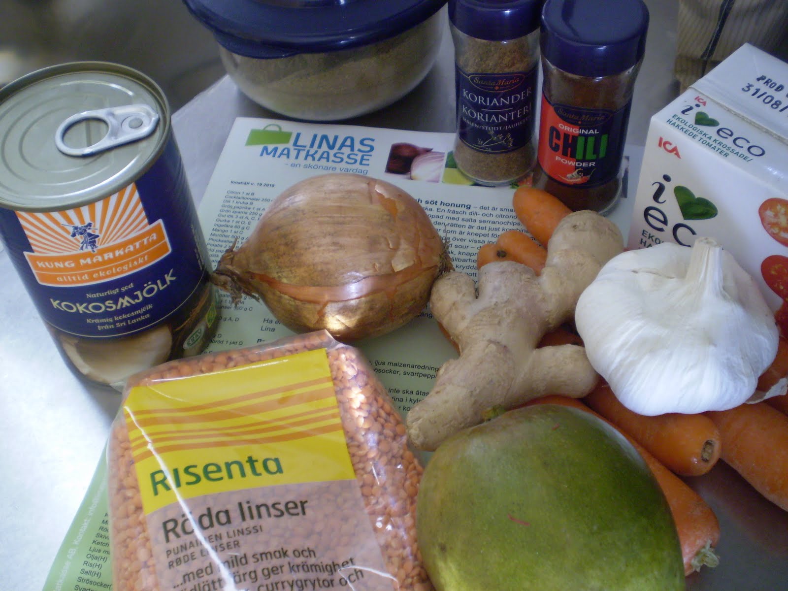 - Häll ner morötter, 3dl torkade röda linser, 4 dl vatten, 1 burk krossade tomater och cirka 200ml kokosmjölk. Koka upp och låt koka under lock på svag värme i cirka 15 minuter.