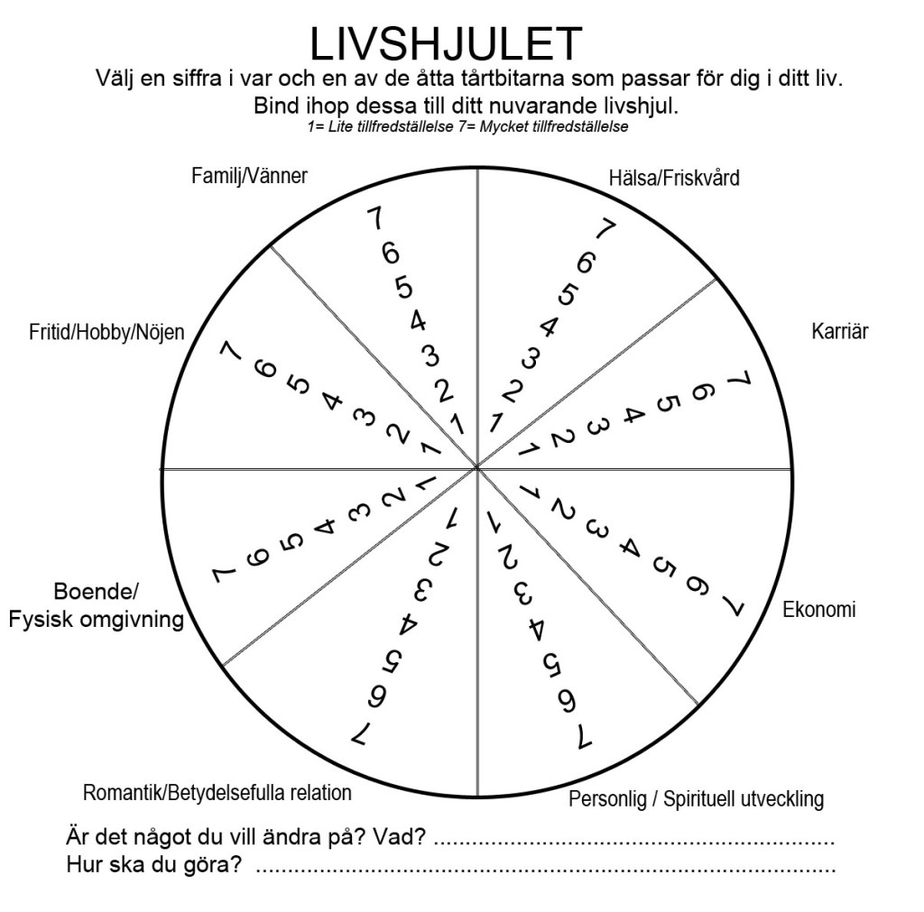 Det finns en fin övning som kan hjälpa till i detta läge som kallas för Livshjulet. Den går ut på att man utvärderar 8 områden i sitt liv och ser var det ”haltar” mest. Inom var och en av de åtta tårtbitarna ska du välja det nummer som bäst motsvarar din nuvarande livssituation för respektive område. Dra sedan en linje för att ansluta siffrorna för dig för att bilda ditt livshjul. Ju rundare form ditt hjul har desto mer balanserat är ditt liv.